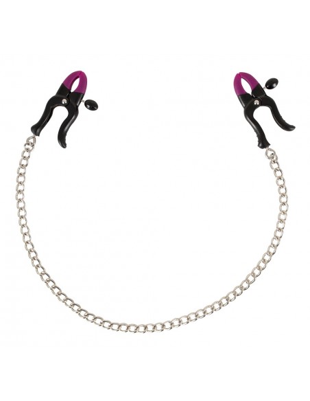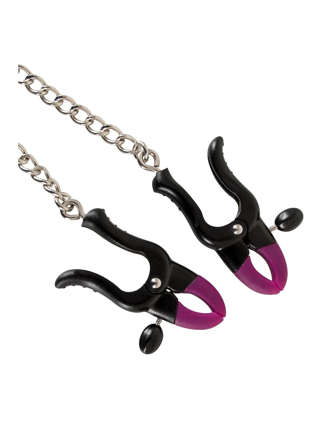 Τι γίνεται με αυτήν την όμορφη αλυσίδα ;! Το καλύτερο με αυτό είναι ότι έρχονται επίσης με δύο ρυθμιζόμενους σφιγκτήρες θηλών στα άκρα. Μήκος αλυσίδας: 37 cm. Πλήρες μήκος: 52 εκ. Σε ασημί χρώμα/μαύρο/μοβ. Υλικό: πολυανθρακικό, σιλικόνη (μωβ καλύμματα), χάλυβας (αλυσίδα), ανθρακούχος χάλυβας