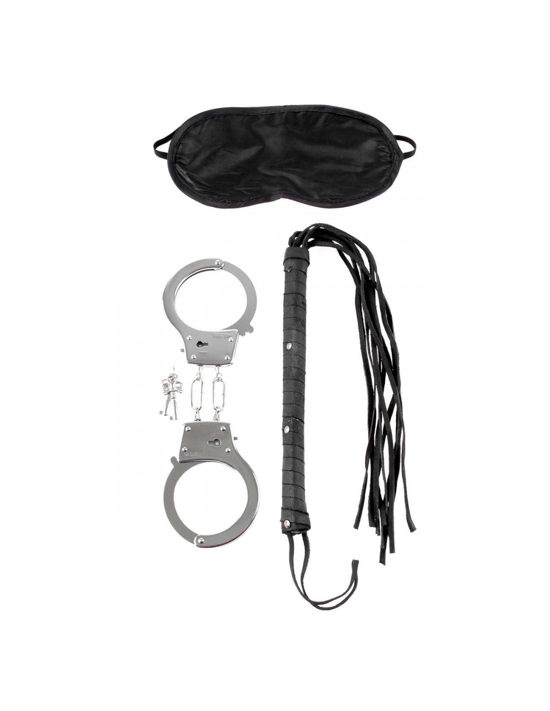 Συγκεκριμένα, αυτό το κιτ περιλαμβάνει μια σατέν μάσκα, ένα ζευγάρι μεταλλικές χειροπέδες με κλειδί και ένα flogger, ώστε να ξεκινήσετε την εξερεύνηση στον κόσμο των φετιχιστικών αισθήσεων, της κυριαρχίας και της υποταγής….Η σατέν μάσκα θα φροντίσει να στερήσει την ιδιότητα της όρασης, με αποτέλεσμα να αυξηθούν κατακόρυφα οι υπόλοιπες αισθήσεις, ενώ οι χειροπέδες θα ακινητοποιήσουν την κίνηση των χεριών και το μαστίγιο-flogger θα δημιουργήσει σε κάθε του επαφή ένα κρεσέντο ηδονικού “πόνου” και ευχαρίστησης…Μόνο όριο σας, η φαντασία σας!