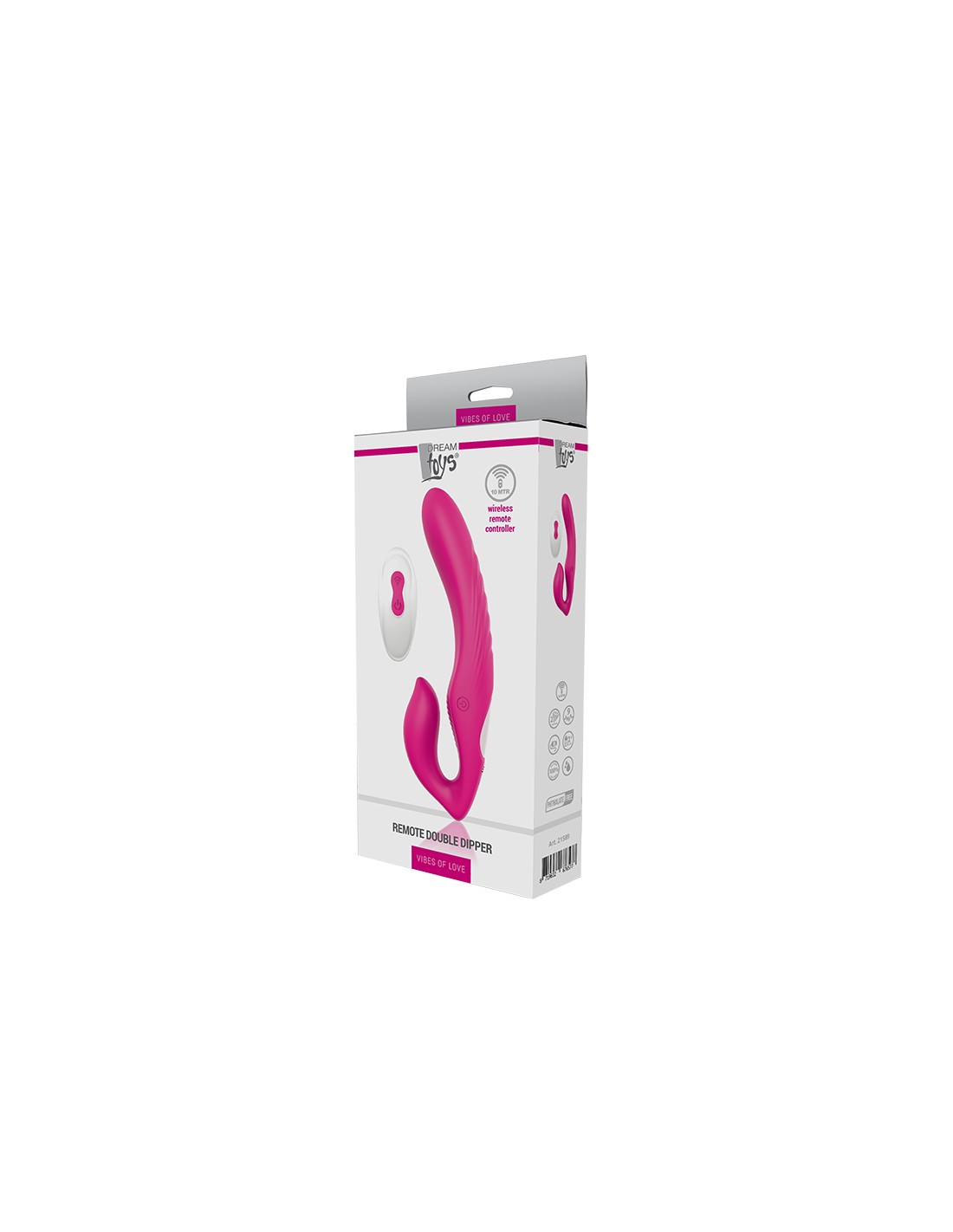 Αυτός ο ισχυρός δονητής δίδυμου είναι κατάλληλος για ζευγάρια και σόλο παιχνίδι. Το Double Dipper είναι ευέλικτο. Το κοντό άκρο μπορεί να κινηθεί υπό γωνία 120 μοιρών. Μπορεί να χρησιμοποιηθεί ως strapless strap-on. Το Double Dipper είναι κατασκευασμένο από σιλικόνη ασφαλούς αμαξώματος και διαθέτει 2 κινητήρες και ασύρματο τηλεχειριστήριο με απόσταση 10 μέτρων. Τόσο ο δονητής όσο και το τηλεχειριστήριο είναι επαναφορτιζόμενοι. Ο ισχυρός κινητήρας προσφέρει 9 διαφορετικά σχέδια δόνησης. Απολαύστε έντονη διπλή διέγερση χάρη στο εύκαμπτο σχήμα του Remote Double Dipper, το οποίο διασφαλίζει ότι οι δονήσεις γίνονται αισθητές στον κόλπο και την κλειτορίδα. Το Double Dipper μπορεί επίσης να λειτουργεί ανεξάρτητα από το τηλεχειριστήριο.